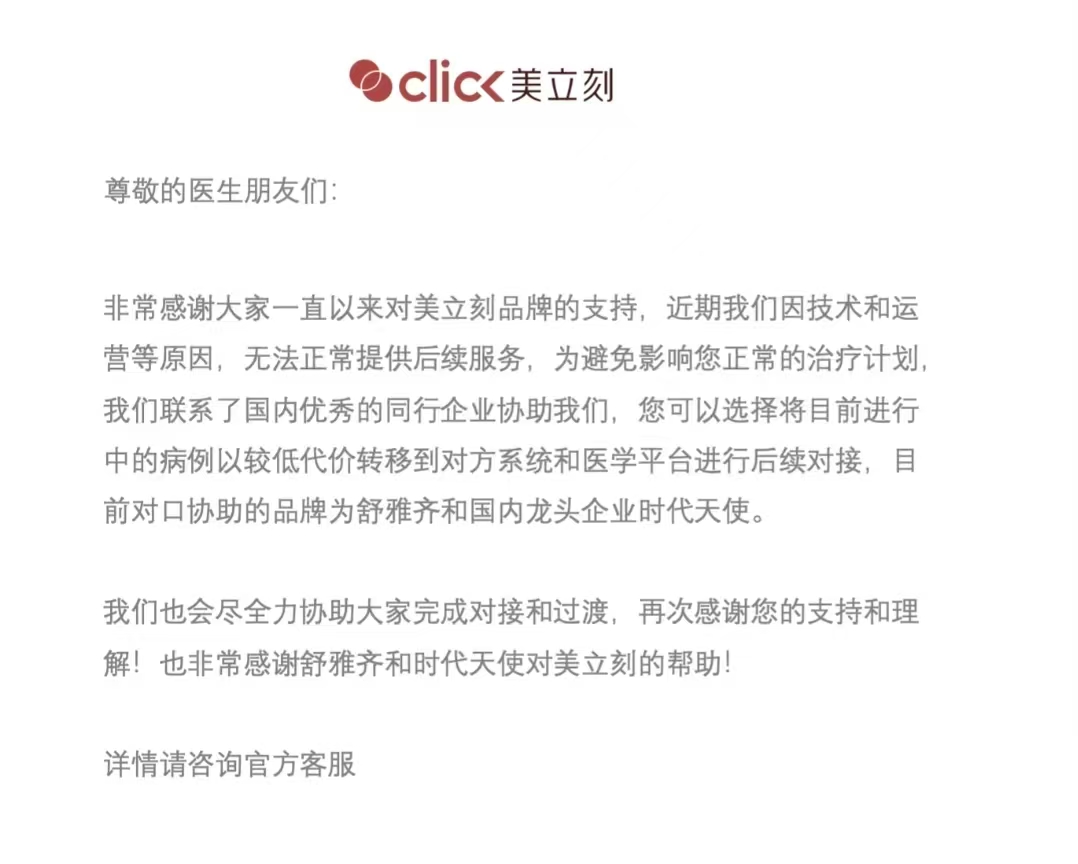 12月9日,美立刻在官方渠道发布关于服务停止及病例转移的通知。该通知明确指出,品牌运营主体北京缔佳医疗器械有限公司因 “技术和运营等原因” ,已无法正常提供后续服务。